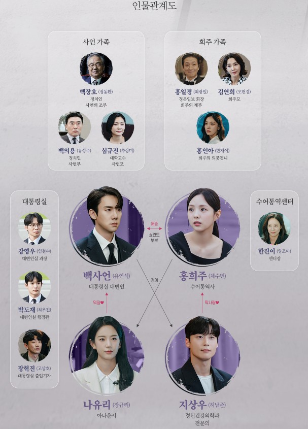 - 유연석: 백사언 역 - 대통령실 최연소 대변인, 홍희주의 남편